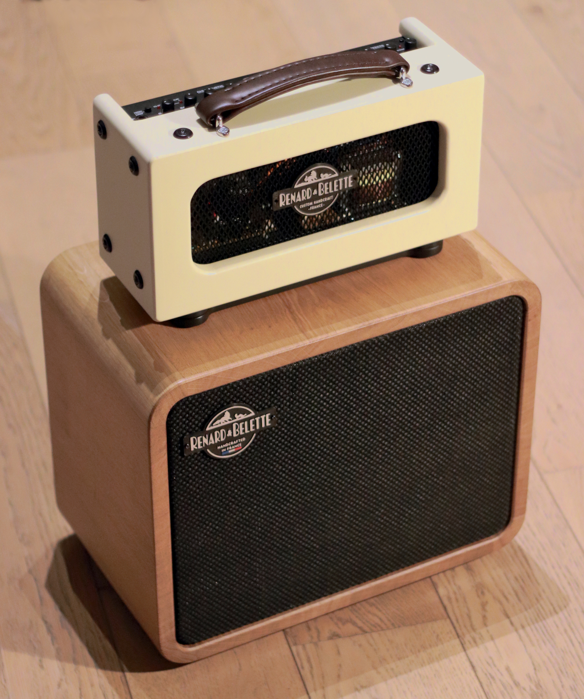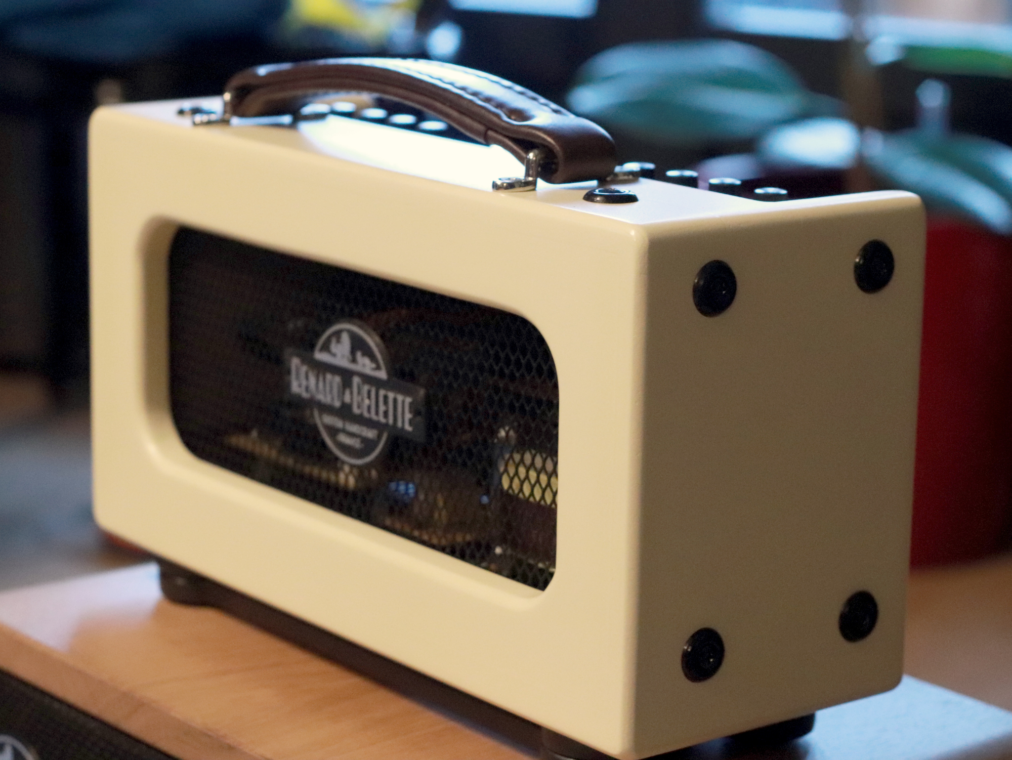 Tête d’ampli guitare réalisée à partir d’un ampli transistor récupéré sur un vieux combo, et reconditionné dans une toute nouvelle ébénisterie, laquée couleur crème